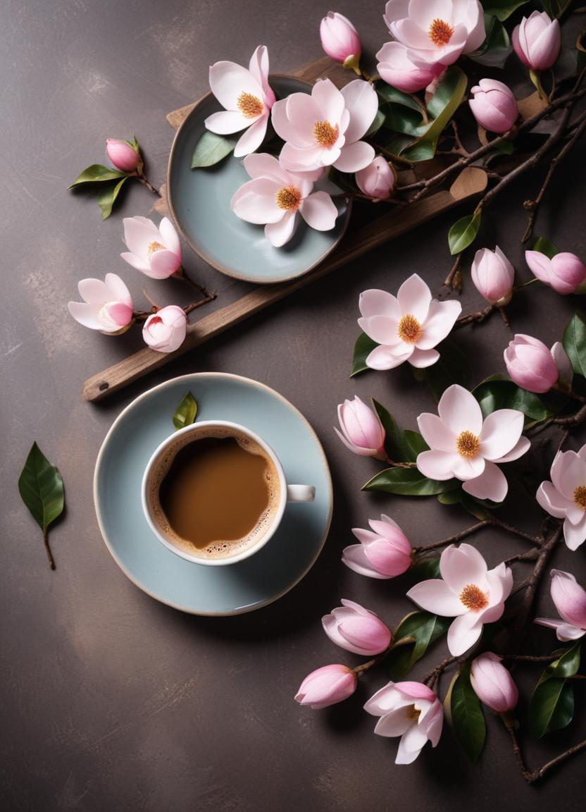 A cup of coffee sits beside soft pink flowers on a gray table. The arrangement creates a tranquil and inviting atmosphere.