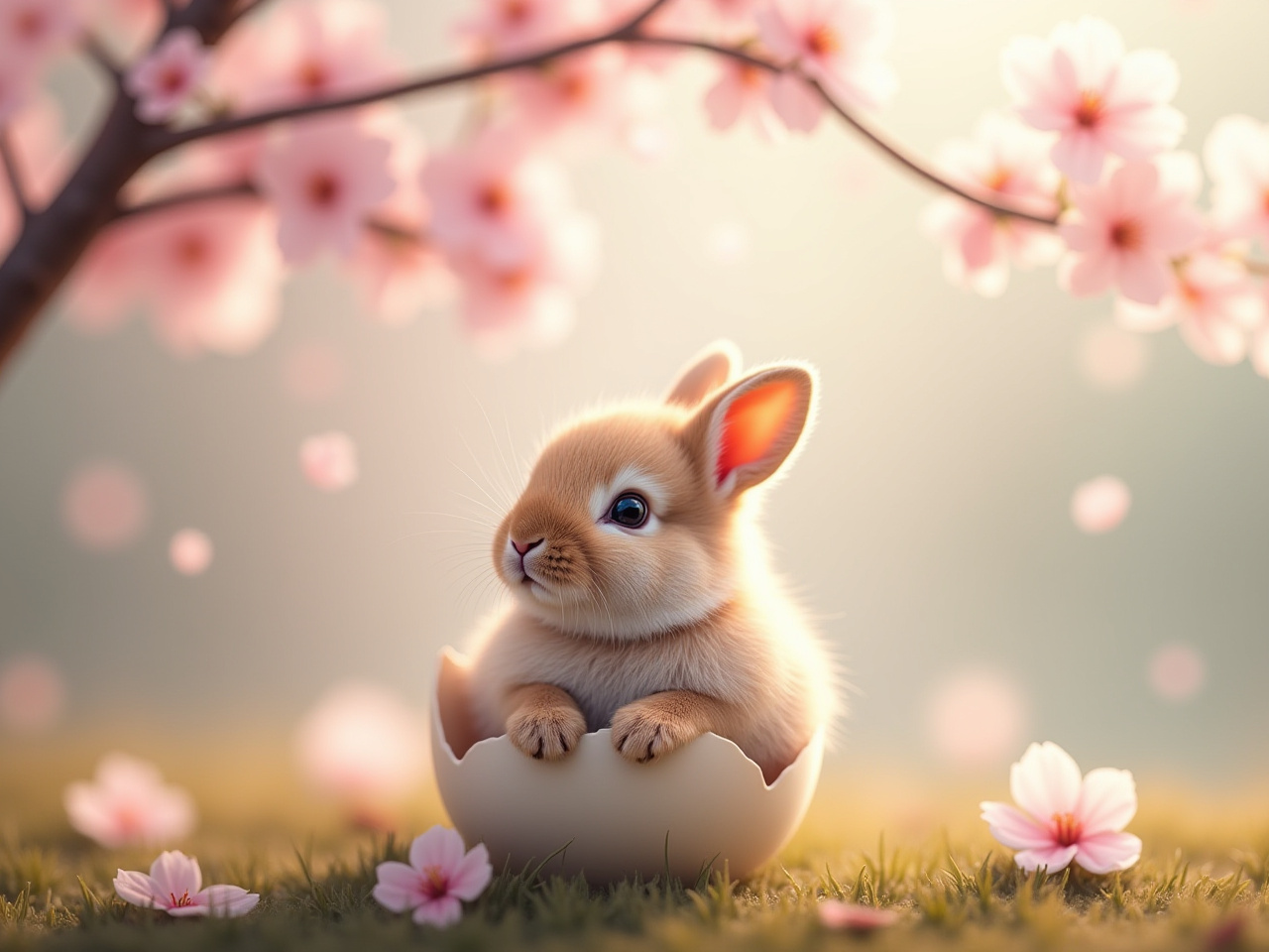 A small bunny rests in a cracked egg under pink cherry blossom branches during spring, surrounded by blooming flowers and soft morning light.
