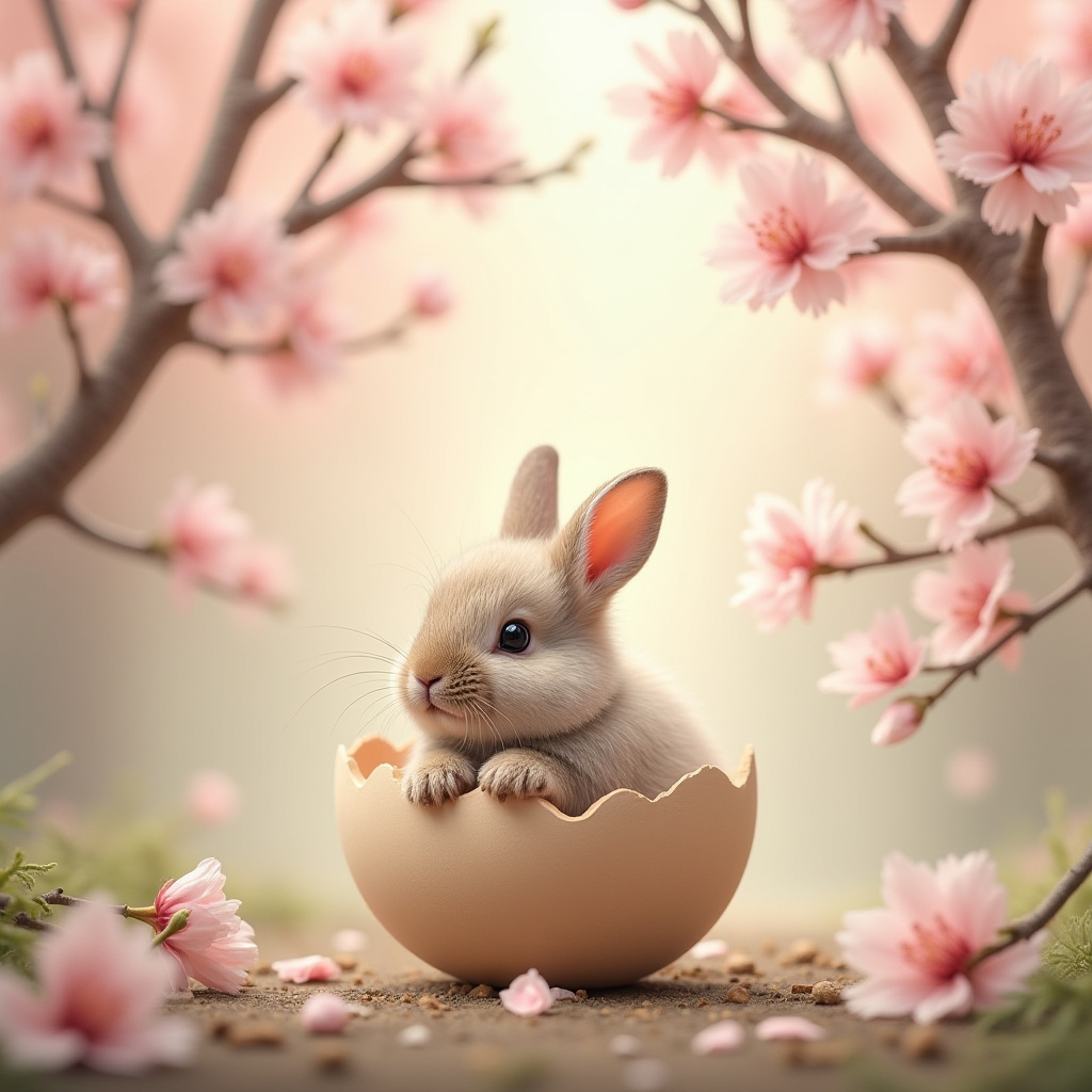 A small bunny peeks out of a cracked eggshell surrounded by blooming cherry blossoms, evoking a charming spring atmosphere.