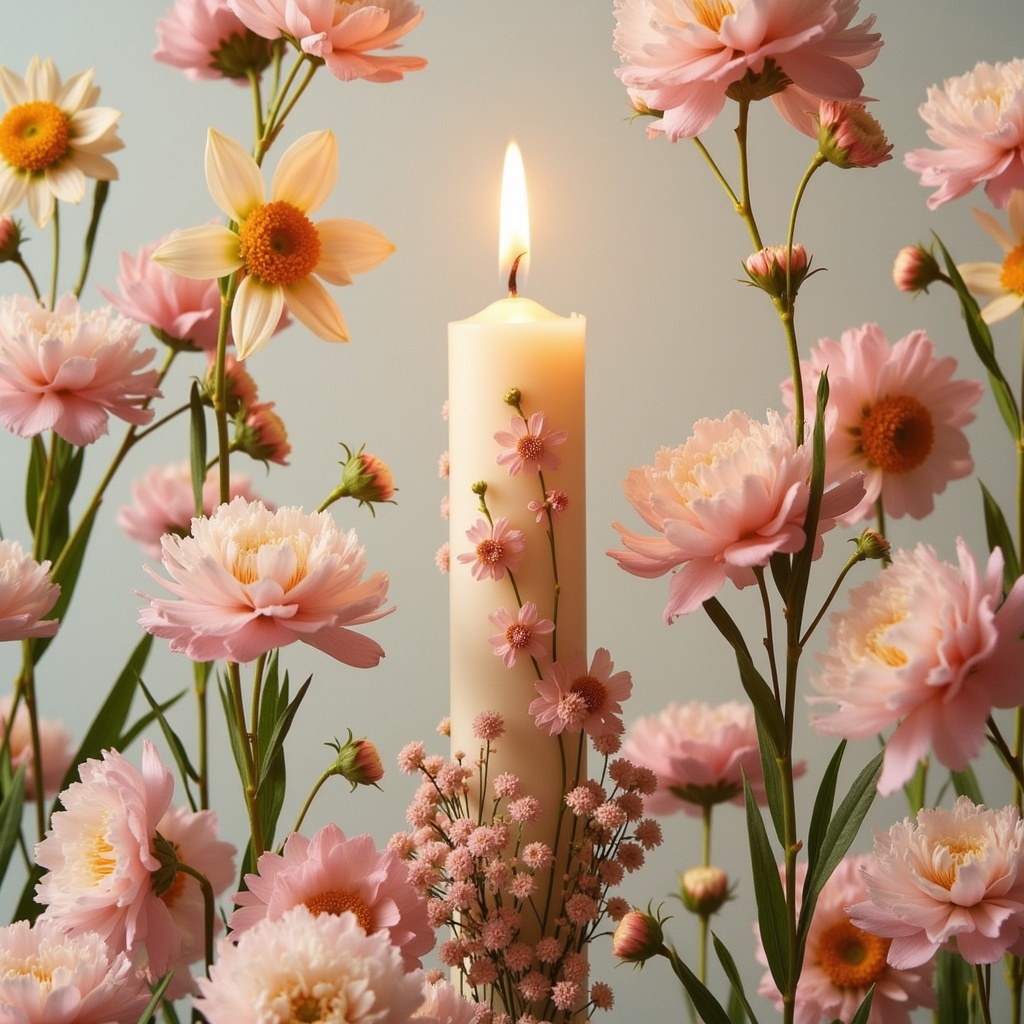 Delicate pink flowers surround a lit white candle, creating a tranquil atmosphere perfect for relaxation or meditation.