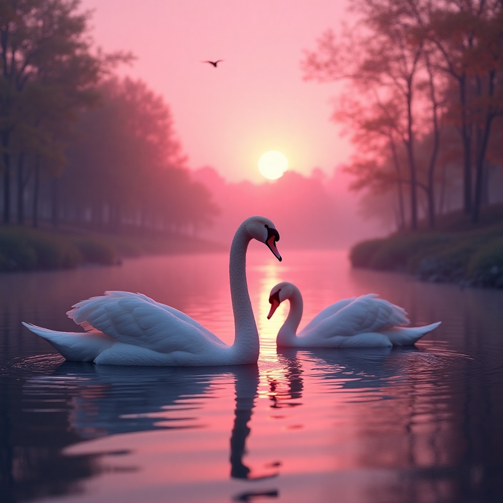 Two elegant swans gracefully glide across calm waters as the sun sets, painting the sky with warm hues and reflecting on the surface.