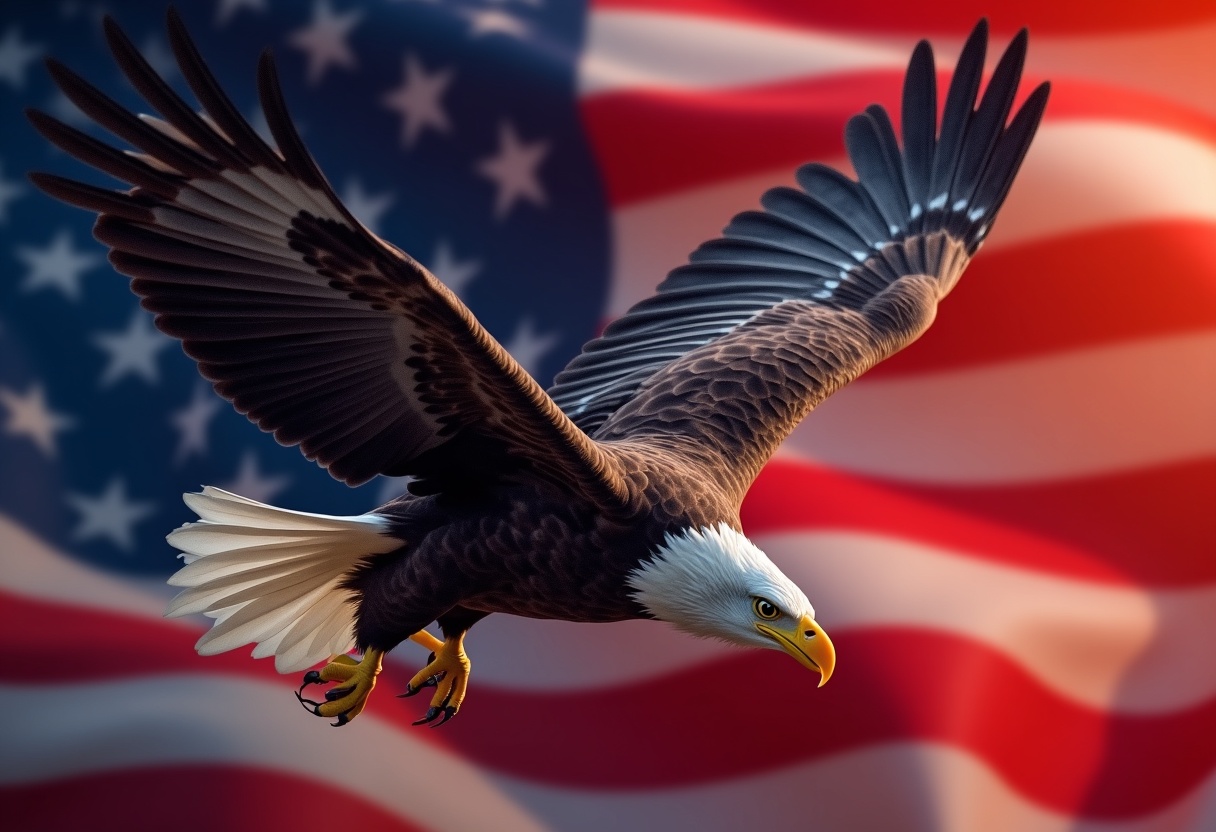 A bald eagle glides through the sky with its wings spread wide, against a backdrop of the American flag, symbolizing freedom and strength.