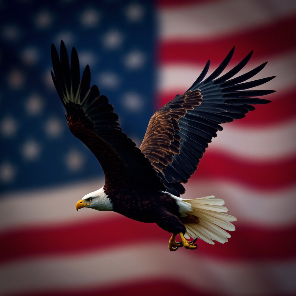 A majestic bald eagle flies gracefully against the backdrop of an American flag, showcasing its powerful wings and striking features.